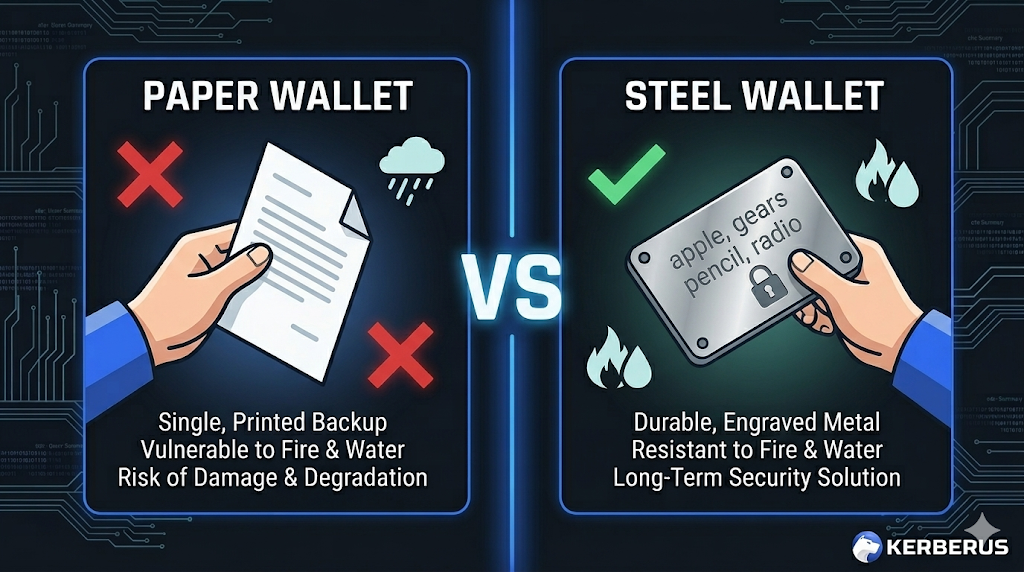 If you want a physically durable offline backup, steel wallets are a step up. They are fire-resistant, waterproof, and designed specifically for seed phrase storage. They are also expensive, and add one more physical item to secure.