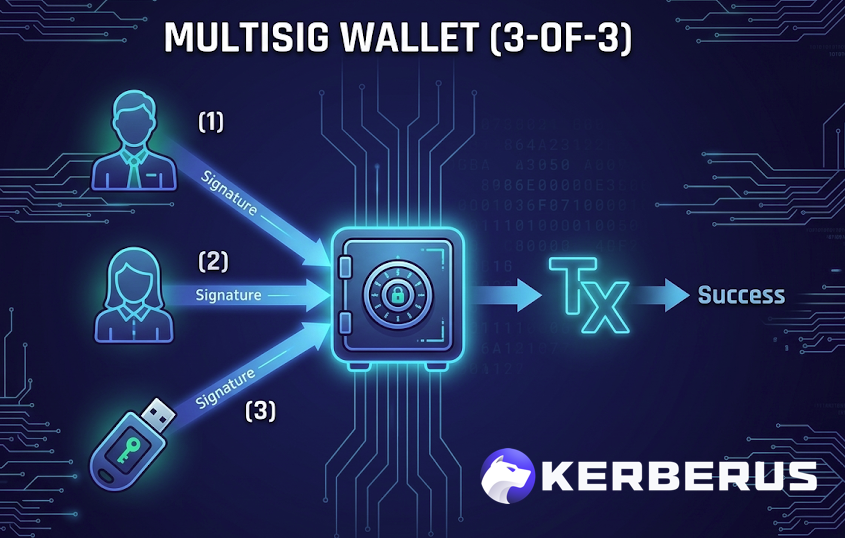 A multisig wallet requires multiple private key approvals before any transaction goes through. A 2-of-3 setup, for example, means that two out of three designated keys must sign before funds move. No single compromised key is enough to authorise a transfer.
