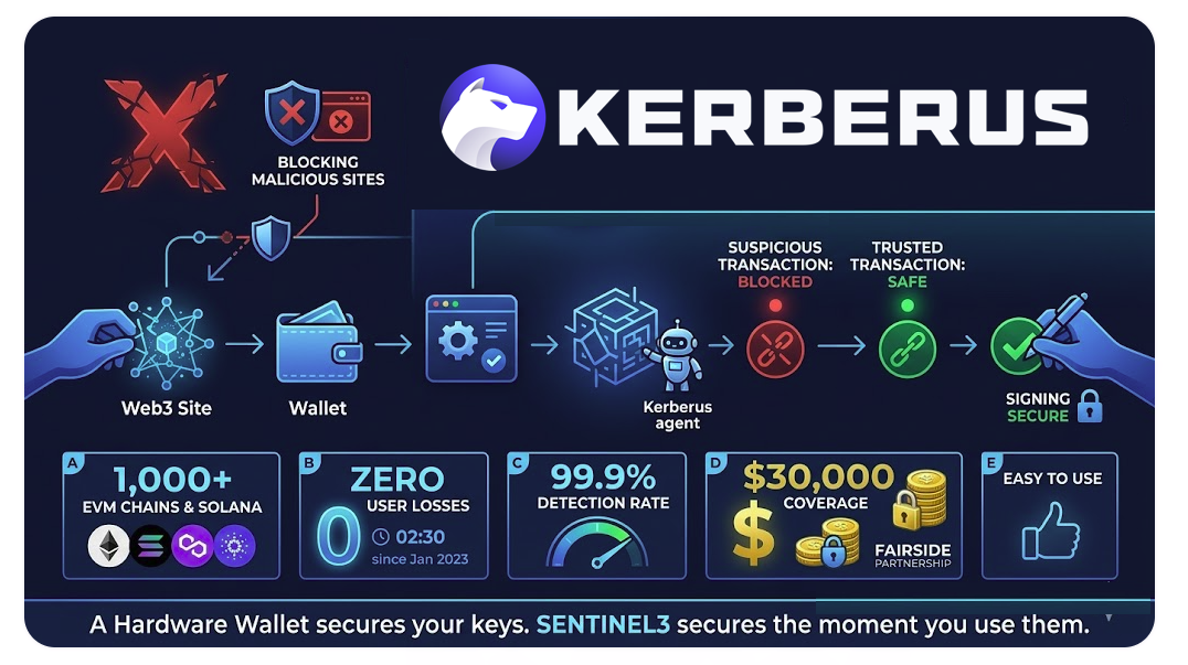 Kerberus Sentinel3 operates as a browser extension that monitors Web3 activity in real time, blocking malicious sites before wallet connection and flagging suspicious transactions before you sign them. It covers 1,000+ EVM chains and Solana, requires no Web3 knowledge to operate, and has recorded zero user losses since January 2023. For transactions that do slip through its 99.9% detection rate, up to $30,000 in coverage is available through Kerberus’s Fairside partnership.